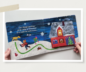 O cărticică de dimensiuni mici, cu colțuri rotunjite, potrivită pentru degetele și mânuțele bebelușilor curioși. Cei mici descoperă un decor de iarnă înzăpezit împreună cu Omida mâncăcioasă, cel mai cunoscut personaj al lui Eric Carle. Povestea e scrisă sub forma unor ghicitori, în versuri, iar cei mici descoperă răspunsul întrebărilor ridicând clapetele. Experiența senzorială este îmbogățită și de traseele pe care cei mici le pot urmări cu degetul. Vă încurajez să-i provocați pe cei mici să găsească Omida mâncăcioasă pe fiecare pagină, e un exercițiu tare bun de observație.